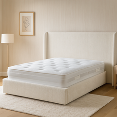 Elevate your bedroom with The Luna Extended Bed. Featuring a wide extended headboard and elegant curved wings, this timeless design is a must-have. Constructed from a solid hardwood mix, it offers exceptional strength and stability. With over 30 fabric options, customize the bed to perfectly compliment your style. Available with traditional slats, solid base, or gas lift storage. Handmade to order for a personalized touch.